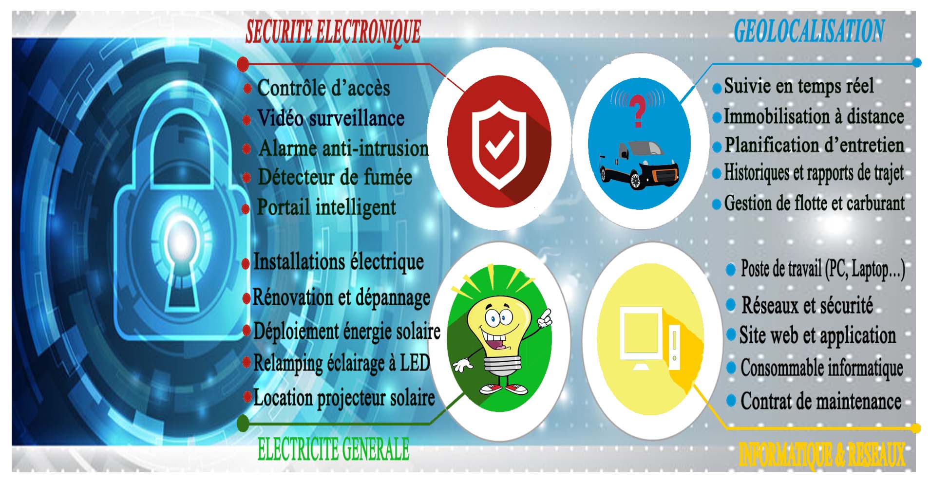 Nous vous proposons des solutions fiable allant des modèles standard aux installations personalisées dans le domaine de la sécurité électronique tel que: contrôle d'accès, vidéosurveillance, alarmes et anti-intrusion, détection incendie, portail intelligent. EN SAVOIR +